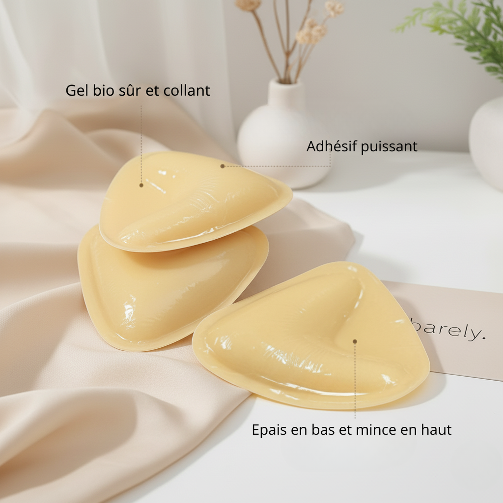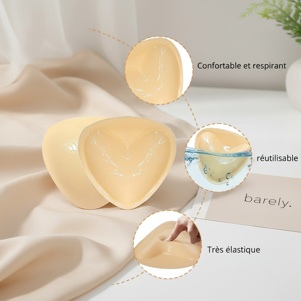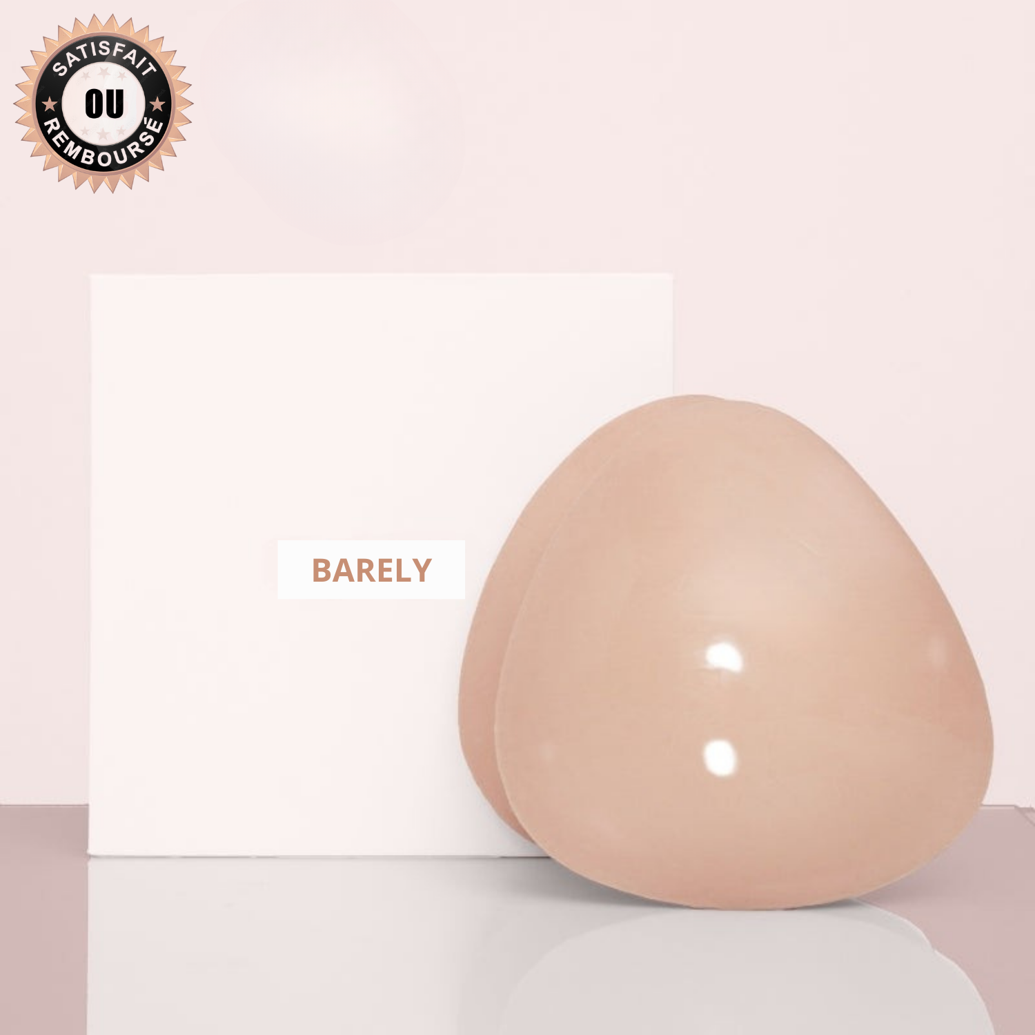 À la différence des coques classiques, les coussinets brevetées BARELY sont adhésives des deux côtés : elles se fixent à la fois sur la peau et sur le vêtement, assurant ainsi un maintien optimal et évitant tout risque de glissement.